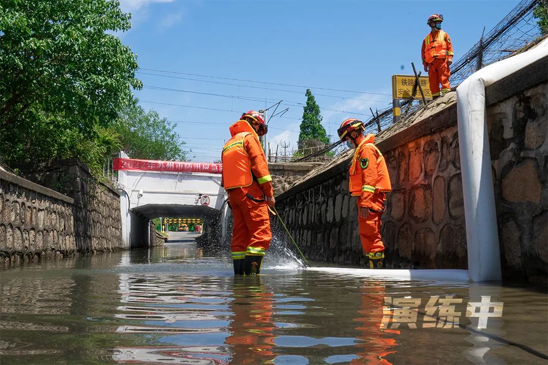 以受強對流天氣影響,蘇州市局部地區(qū)遭遇特大暴雨,導致陽澄湖、京杭運河水位快速上升,唯亭街道部分地段內(nèi)澇嚴重,急需搶救、轉(zhuǎn)移、安置受災群眾為背景:市級演練模擬雙馬街下穿滬寧鐵路通道排水泵房停電,通道內(nèi)大量積水觸發(fā)防汛監(jiān)測警報,園區(qū)、街道兩級立即組織疏導搶險應急;區(qū)級演練則模擬了某過渡房小區(qū)內(nèi)澇嚴重,部分居民受困,急需組織排澇和人員轉(zhuǎn)移的場景。