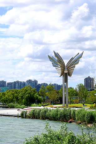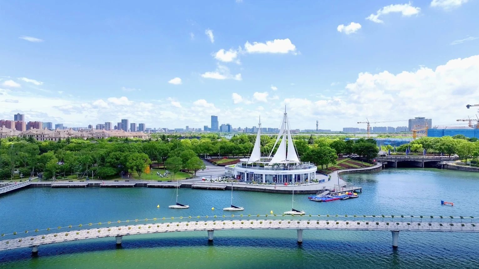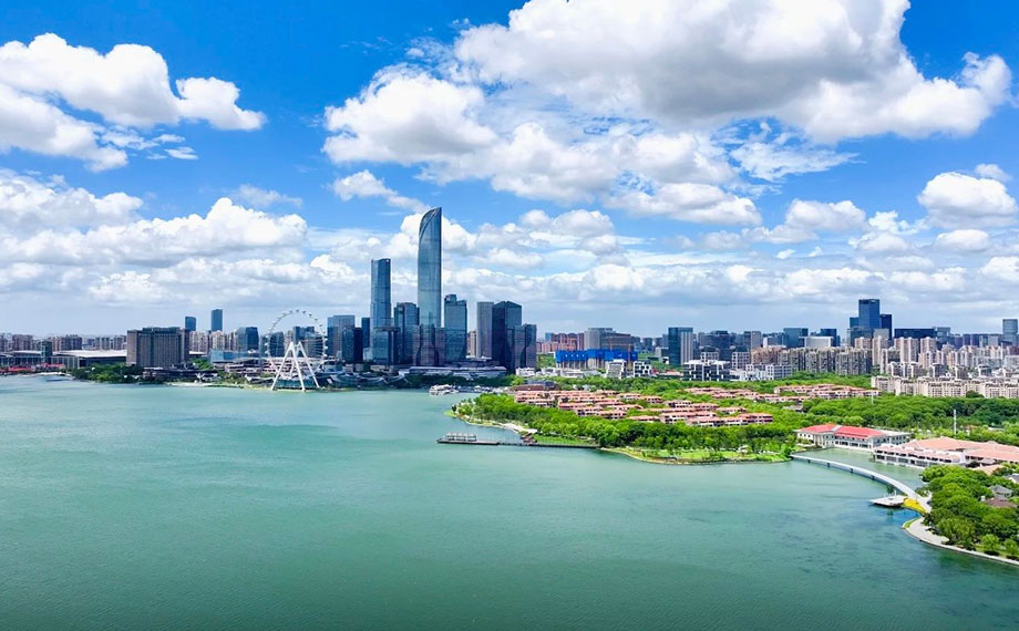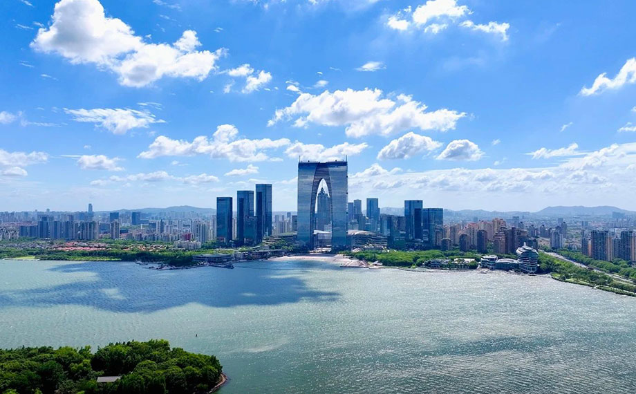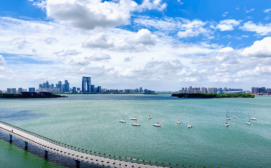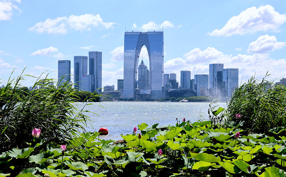 金雞湖右岸重點項目加快建設,涌動著發展活力,“蘇州之眼”摩天輪等地標建筑引得游人駐足流連。