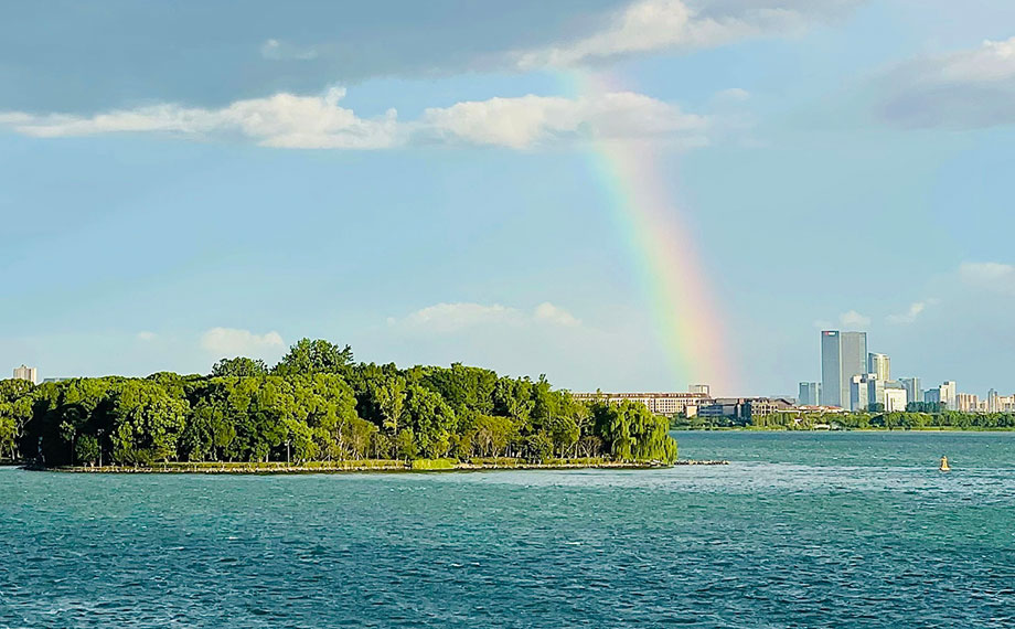 幸運的話,還能捕捉到絢麗的彩虹。看這座七彩橋梁連接著悠悠白云與粼粼碧水,為水晶天增添一抹夢幻的色彩。