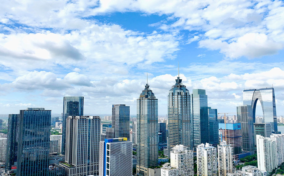 摩天大樓的玻璃幕墻化作鏡面,倒映著藍天白云,錯落有致的現代建筑與自然風光和諧相融。