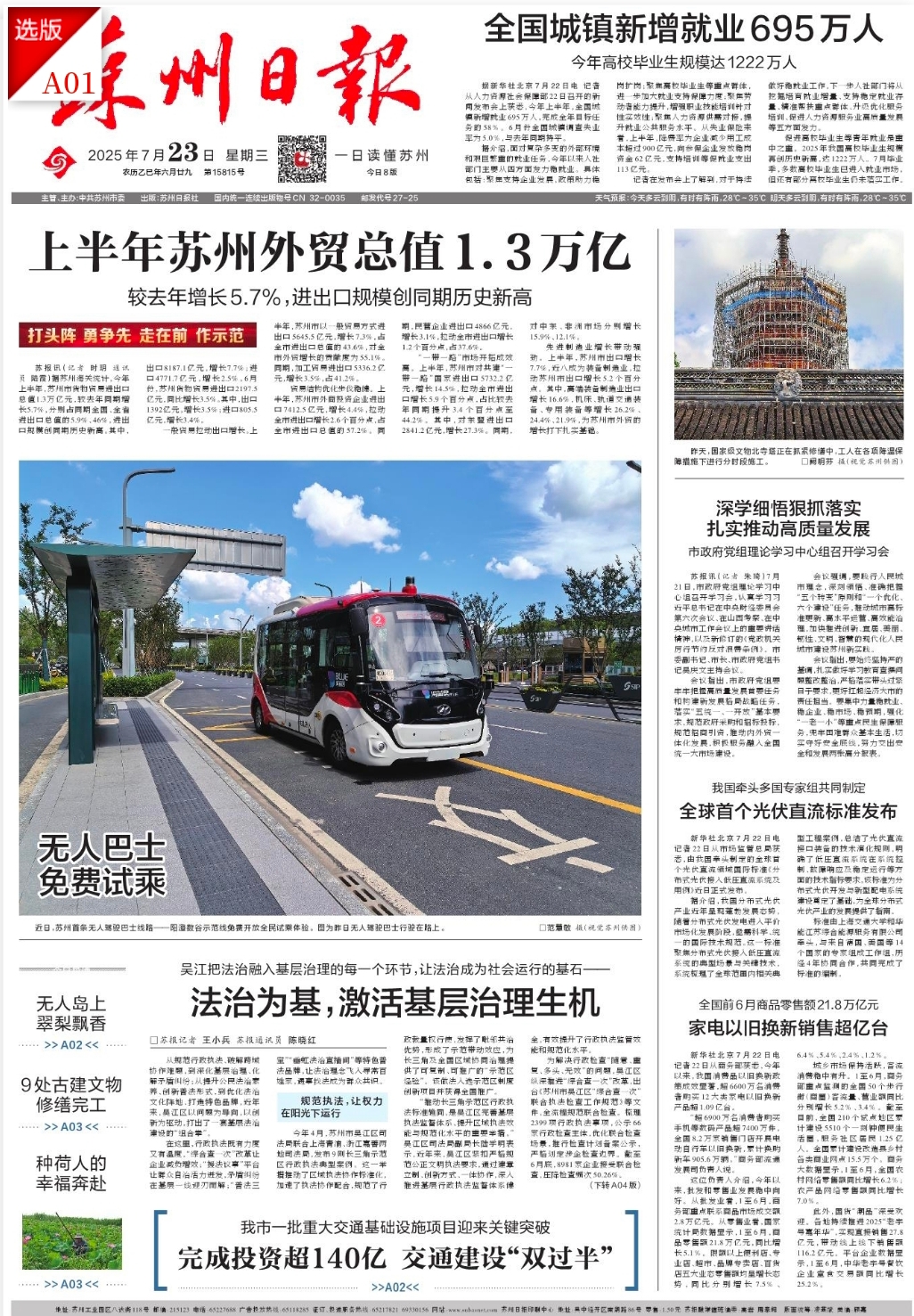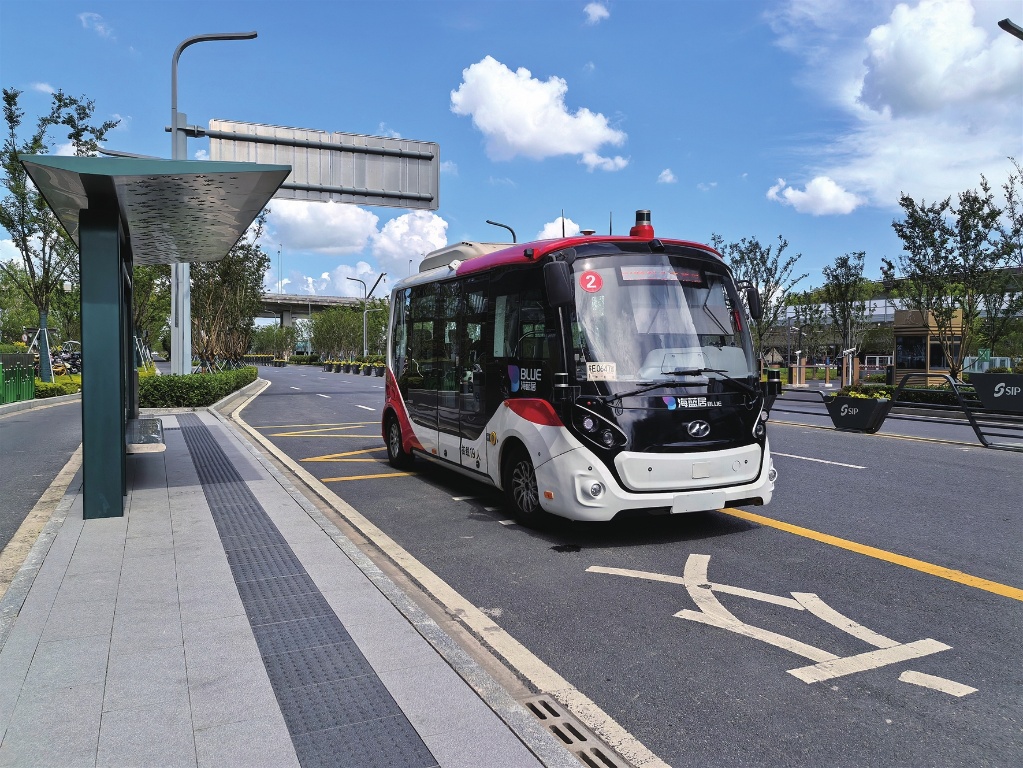 近日,蘇州首條無人駕駛巴士線路——陽澄數(shù)谷示范線免費開放全民試乘體驗。圖為昨日無人駕駛巴士行駛在路上。(視覺蘇州供圖)