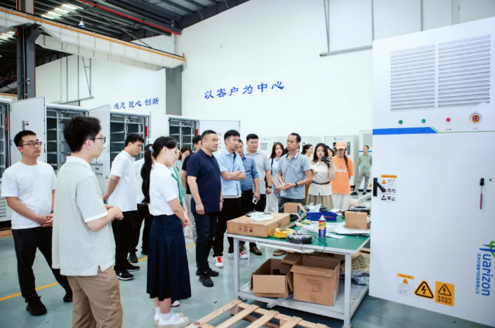 活動伊始,企業代表一行實地參訪了蘇州華儲電氣科技有限公司,近距離觀摩企業儲能系統生產線,深入了解企業在儲能領域的技術創新與產品應用。據介紹,蘇州華儲電氣科技有限公司于2022年在蘇相合作區成立,是A股上市公司新華都特種電氣股份有限公司的控股子公司,其母公司是相關細分市場的龍頭企業。在企業生產車間,相關負責人詳細講解了公司的發展歷程、儲能產品相關核心技術和優勢,讓嘉賓們深刻感受到儲能技術如何從實驗室走向產業化。