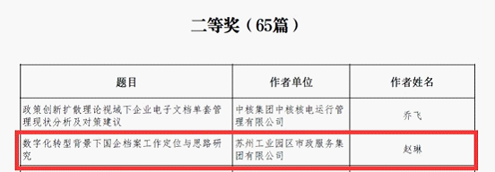 據(jù)悉,今年 3 月,中國(guó)檔案學(xué)會(huì)面向全國(guó)青年檔案工作者開始論文征集,并收到投稿論文 1191 篇。中國(guó)檔案學(xué)會(huì)組織專家對(duì)入選論文進(jìn)行了認(rèn)真評(píng)審,評(píng)出一等獎(jiǎng)?wù)?/span>文 50 篇、二等獎(jiǎng)論文 65 篇、三等獎(jiǎng)?wù)撐? 85 篇、入選論文 777 篇。近年來,園區(qū)檔案管理中心積極開展檔案科研工作,承擔(dān)多項(xiàng)國(guó)家、省、市課題,園區(qū)檔案工作者積極參與國(guó)家、省、市檔案學(xué)術(shù)交流,在《中國(guó)檔案》《檔案與建設(shè)》等核心期刊發(fā)表論文 10 余篇,在宣傳園區(qū)檔案工作,推動(dòng)園區(qū)及蘇州檔案事業(yè)高質(zhì)量發(fā)展上做出積極貢獻(xiàn)。