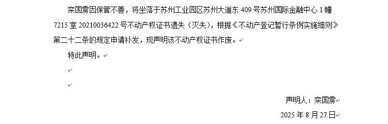 關于蘇州工業園區蘇州大道東409號蘇州國際金融中心1幢7215室20210036422號不動產權證書遺失聲明