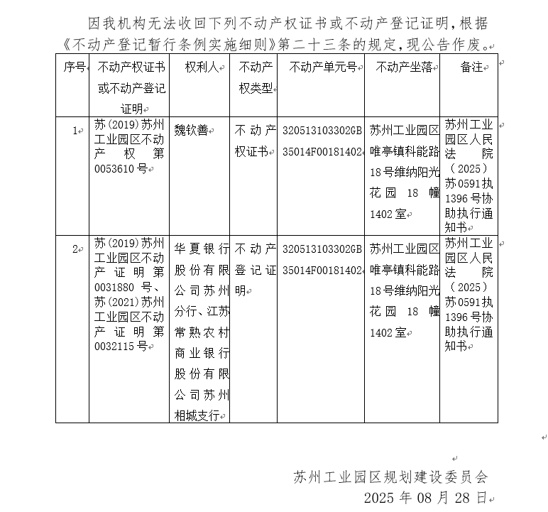不動(dòng)產(chǎn)權(quán)證書/登記證明作廢公告蘇園 證廢字2025(0131)號(hào)(維納陽光花園18幢1402室)
