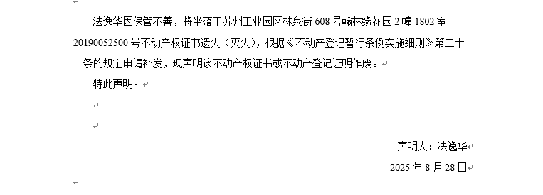 關于蘇州工業園區林泉街608號翰林緣花園2幢1802室20190052500號不動產權證書遺失聲明
