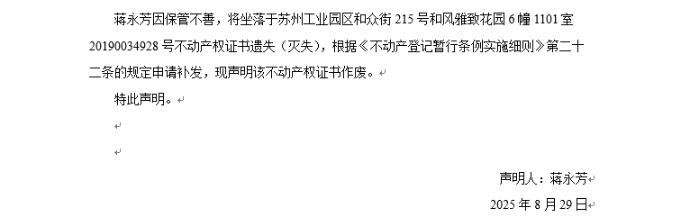 關(guān)于蘇州工業(yè)園區(qū)和眾街215號和風(fēng)雅致花園6幢1101室20190034928號不動產(chǎn)權(quán)證書遺失聲明