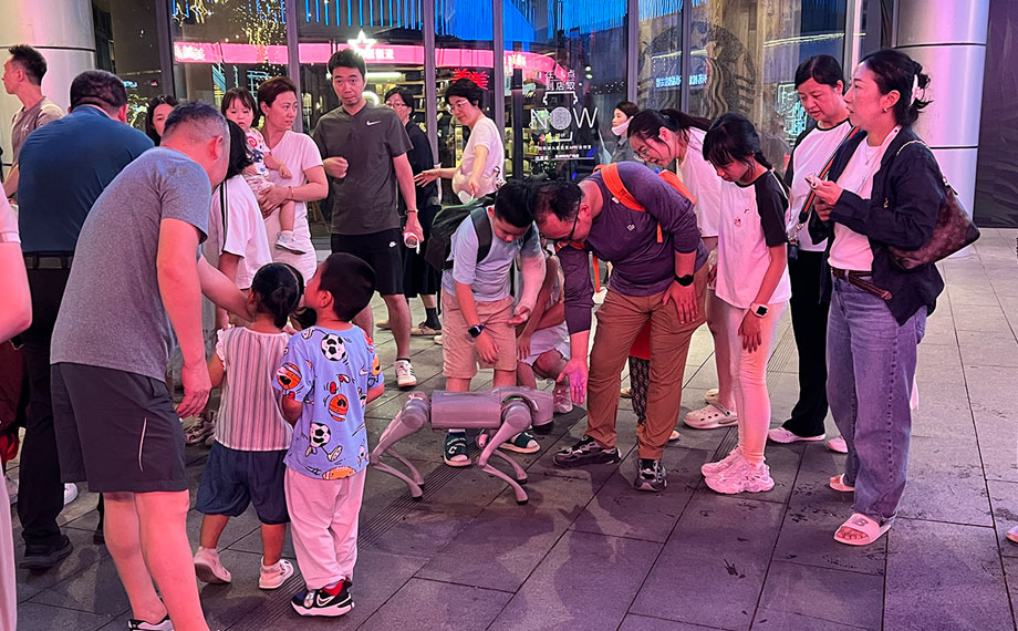 天幕下,變幻著燈光的地面噴泉讓愛(ài)玩水的萌娃樂(lè)此不疲,而臨近的水岸音樂(lè)會(huì)甄選市集上,哪吒造型的機(jī)器人、身姿靈活的機(jī)器狗也與大家握握手、跳個(gè)舞熱情互動(dòng),讓往來(lái)的大朋友、小朋友心動(dòng)不已。“水岸音樂(lè)會(huì)積聚人氣,實(shí)現(xiàn)了很好的引流,不僅提升了市民的生活質(zhì)感,也為我們企業(yè)推廣搭建了全新的場(chǎng)景。機(jī)器人正當(dāng)熱點(diǎn),我們與圓融合作,在圓融天幕和月光碼頭都設(shè)置了展臺(tái),提供機(jī)器人的表演、互動(dòng),以及配套小機(jī)器人的售賣(mài),對(duì)于展示企業(yè)形象、能力,展現(xiàn)園區(qū)高科技活力,都是很好的平臺(tái)。”八方機(jī)器人經(jīng)理朱錦介紹說(shuō)。