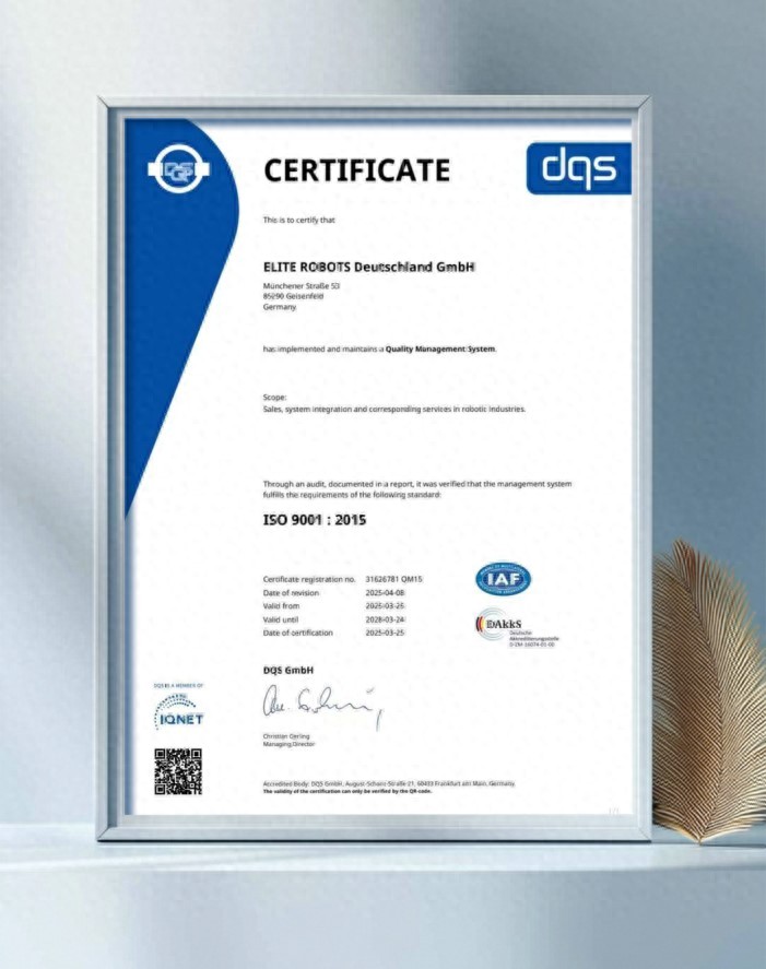 最近、蘇州工業(yè)園區(qū)の企業(yè)エリートロボットは、中國(guó)「ISO9001 三體系認(rèn)証」取得に続き、ELITEROBOTSドイツ有限公司がドイツ國(guó)內(nèi)のISO9001品質(zhì)マネジメントシステム認(rèn)証を正式に取得した。國(guó)産協(xié)働ロボット分野では初めてドイツ國(guó)內(nèi)の認(rèn)証を取得した中國(guó)企業(yè)となり、EUのハイエンド市場(chǎng)への參入に固い基盤を築いた。
