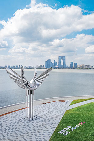 園區開発建設30周年の記念彫刻『飛翔』は、中國とシンガポールの深い友情及び協力ウィンウィンの美しい未來を示し、右岸客廳の輝かしい風景にもなった。李亜平氏一行は右岸客廳エリアに歩き、蕓術、文化、レジャーが融合された一般の民衆の生活體験空間を存分に感じ、園區が協力の初心を覚え、ウィンウィン発展を追求し、中國とシンガポール両國が「全面的で質の高い未來志向のパートナーシップ」の構築に新たな貢獻をすると望んでいる。