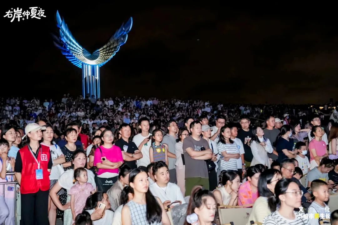 一場夏雨洗盡了白日的悶熱,湖畔涼風(fēng)習(xí)習(xí),正是享受音樂的絕佳時(shí)刻,右岸客廳下沉廣場的臺(tái)階上,早已坐滿了慕名而來的觀眾,飛翔雕塑旁、湖畔步道上處處是翹首以盼的身影。
