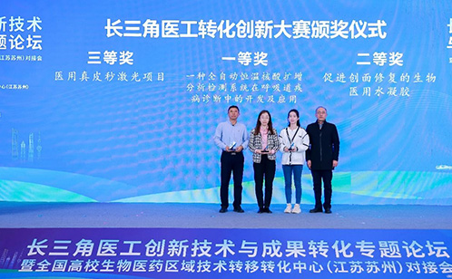 11月22日,長(zhǎng)三角醫(yī)工轉(zhuǎn)化創(chuàng)新大賽共吸引了13個(gè)優(yōu)質(zhì)產(chǎn)業(yè)化項(xiàng)目參賽。論壇現(xiàn)場(chǎng)為“一種全自動(dòng)恒溫核酸擴(kuò)增分析檢測(cè)系統(tǒng)在呼吸道疾病診斷中的開發(fā)及應(yīng)用”等大賽獲獎(jiǎng)項(xiàng)目進(jìn)行頒獎(jiǎng),校地雙方將聚力推動(dòng)項(xiàng)目的產(chǎn)業(yè)化進(jìn)程,助力其在蘇落地。