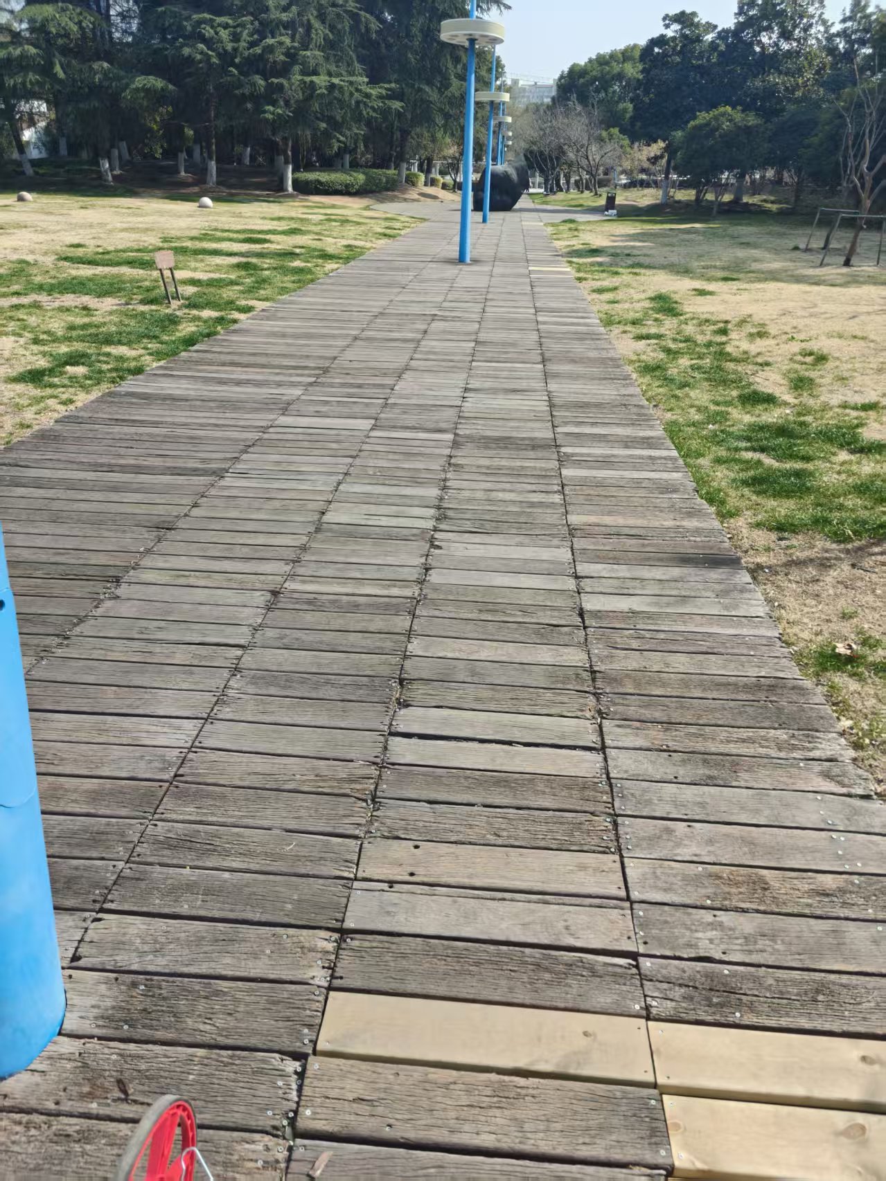 改造前,中央公園的棧道木板因龍骨腐蝕出現松動,密密麻麻的加固螺釘不僅影響美觀,更埋下安全隱患。面對徹底翻新還是局部修復的選擇,園區市政服務集團經過精密策劃、專業測算,將目光投向了那些飽經滄桑的賈拉木板。