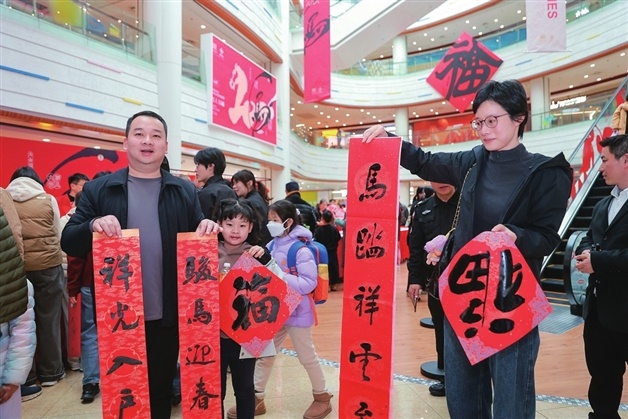 前天下午,蘇州工業園區景城鄰里中心一樓中庭墨香四溢、暖意融融。由新建元鄰里中心公司主辦的“迎新年·送春聯”惠民文化活動如期舉行,顧志軍、姚永強、徐世平、林再成等20余位蘇州書畫名家齊聚一堂,現場揮毫潑墨,為市民免費書寫春聯和福字,并將上千份滿載年味與祝福的新春文創福袋送到居民手中。這項活動已連續開展11年,成為園區居民春節前夕不可或缺的“文化年貨”。