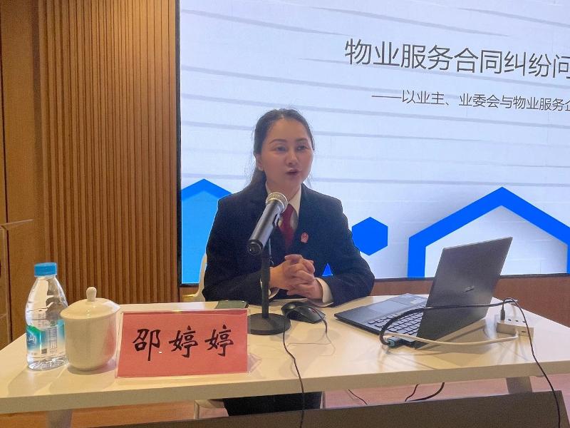 園區(qū)法院員額法官邵婷婷一直從事物業(yè)、勞動爭議審判工作,她將法律理論與實戰(zhàn)案例深度融合,依次闡述了物業(yè)糾紛的主要類型、多種成因、化解難點,深入淺出講述物業(yè)服務(wù)合同糾紛的法律依據(jù)、處理要點,依托具體案例現(xiàn)場模擬業(yè)主、業(yè)委會、物業(yè)三方對話,“沉浸式”教學(xué)給在場學(xué)員們打開了調(diào)解新思路。