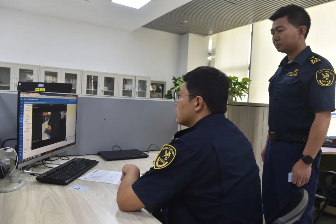 當天11點30分,在園區海關駐唯亭辦事處查檢科辦公室,關員劉振乾、李躍調試好設備,電腦界面彈出“海關屬地查檢業務系統”,企業倉庫中等待出口的貨物進入海關監管視線。兩名關員向網絡另一端的企業人員出示執法證件后,指導企業人員拍攝貨物細節。對照企業預約遠程屬地查檢時提交的《海關特殊物品出入境衛生檢疫審批單》,兩名關員詳細核對貨物的名稱、批號、規格、有效期等關鍵信息,檢查物品包裝是否完好、相關標識是否清晰。約10分鐘后,貨物全部關鍵信息核對無誤,關員實時錄入查檢記錄,企業人員線上遠程確認結果,隨后,關員提交的記錄經審核后,貨物得到放行。