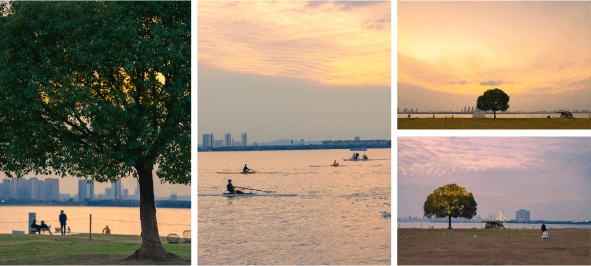 The Egrets Park is popular with sunsetlovers. It is common to see people holding up their mobile phones to record thesunsets through their lenses, or simply standing still and watching the lakeand the buildings on the other side of the lake.The sunlight turns soft at dusk, tenderlyfalling on the people as if it was trying to dissipate the fatigue for them. T...