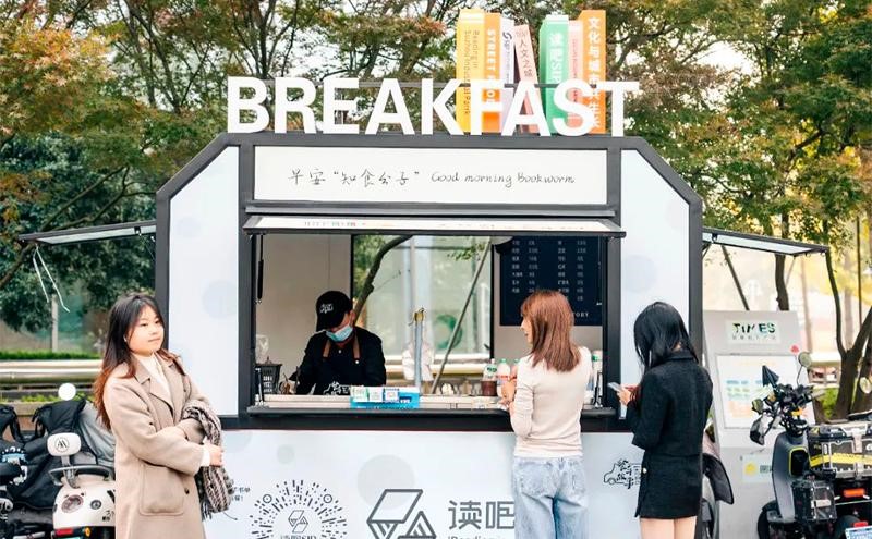By scanning the QR code, customers can log on the online reading systemof the festival and pick any book on the list to read while enjoying theirbreakfast. The readings offered through the breakfast food trucks are just part ofthe huge “treasury of readings” in SIP, which can be opened with “keys” hiddenall over the industrial park.