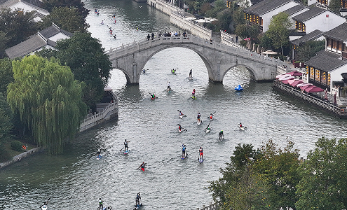 每年一入夏,斜塘河迅速成為水上運動愛好者的“樂園”。從龍舟到槳板,再到皮劃艇……人們或三五成群,或自得其樂,充分享受水上運動帶來的無限趣味。“之前在國外生活時我就很喜歡槳板運動,現在定居蘇州,很開心可以延續這一愛好。斜塘河水域條件好,周邊景色優美、沿岸建筑很有江南韻味,讓人在運動時心曠神怡。”槳板愛好者李想說。