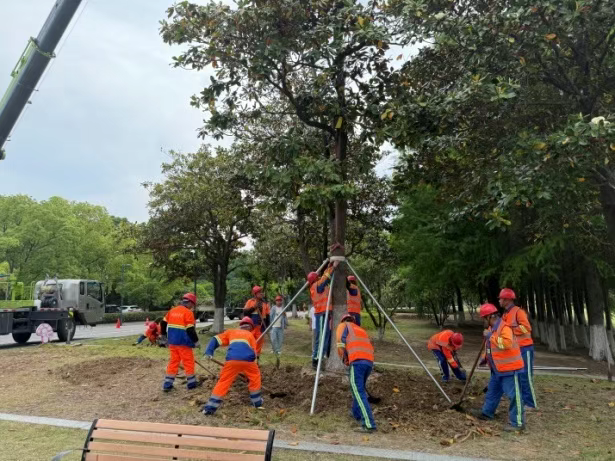本次演練重點針對行道樹倒伏及松動、松動喬木加固等典型險情展開。演練現場,56名專業人員及3臺運輸車輛、吊車協同配合,迅速完成倒伏樹木切割、吊裝與扶正作業,高效恢復道路暢通;同時采用鋼管支撐技術對松動喬木進行加固,最大限度保護綠化成果,降低安全隱患。