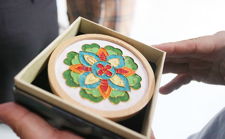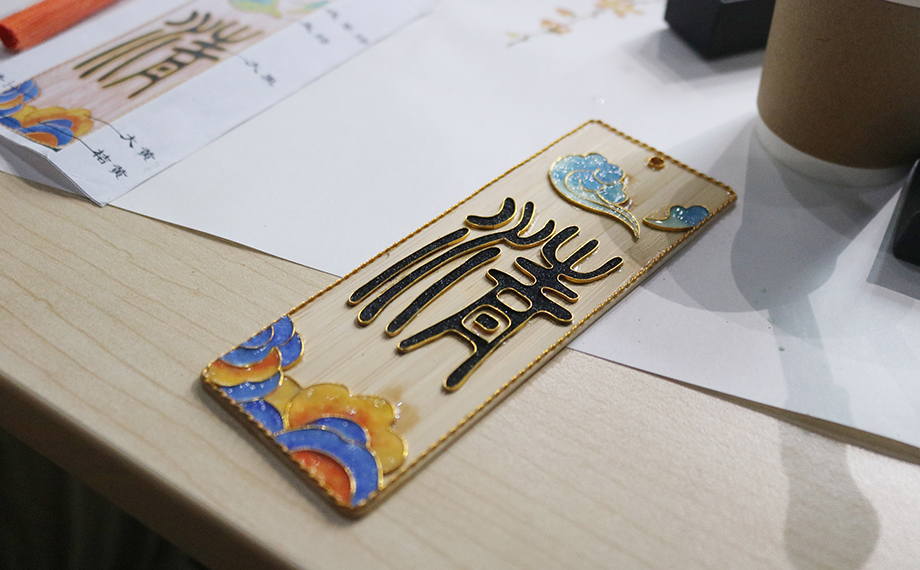 正是因?yàn)橐詼鬄榇淼牧汲純A力為民,社會才能進(jìn)步、時局才能穩(wěn)固,這也為乾隆時期景泰藍(lán)的復(fù)興創(chuàng)造了條件。景泰藍(lán),即掐絲琺瑯工藝,是中國的著名特種金屬工藝品類之一。在隨后的文化體驗(yàn)課環(huán)節(jié),大家興致勃勃地在老師的講解和幫助下參與到景泰藍(lán)手工技藝的體驗(yàn)活動中,以金絲作胎,填充色釉,制作出屬于自己的景泰藍(lán)工藝蓮花杯墊、書簽、小鏡,用蓮心現(xiàn)廉韻,感受傳統(tǒng)文化魅力。